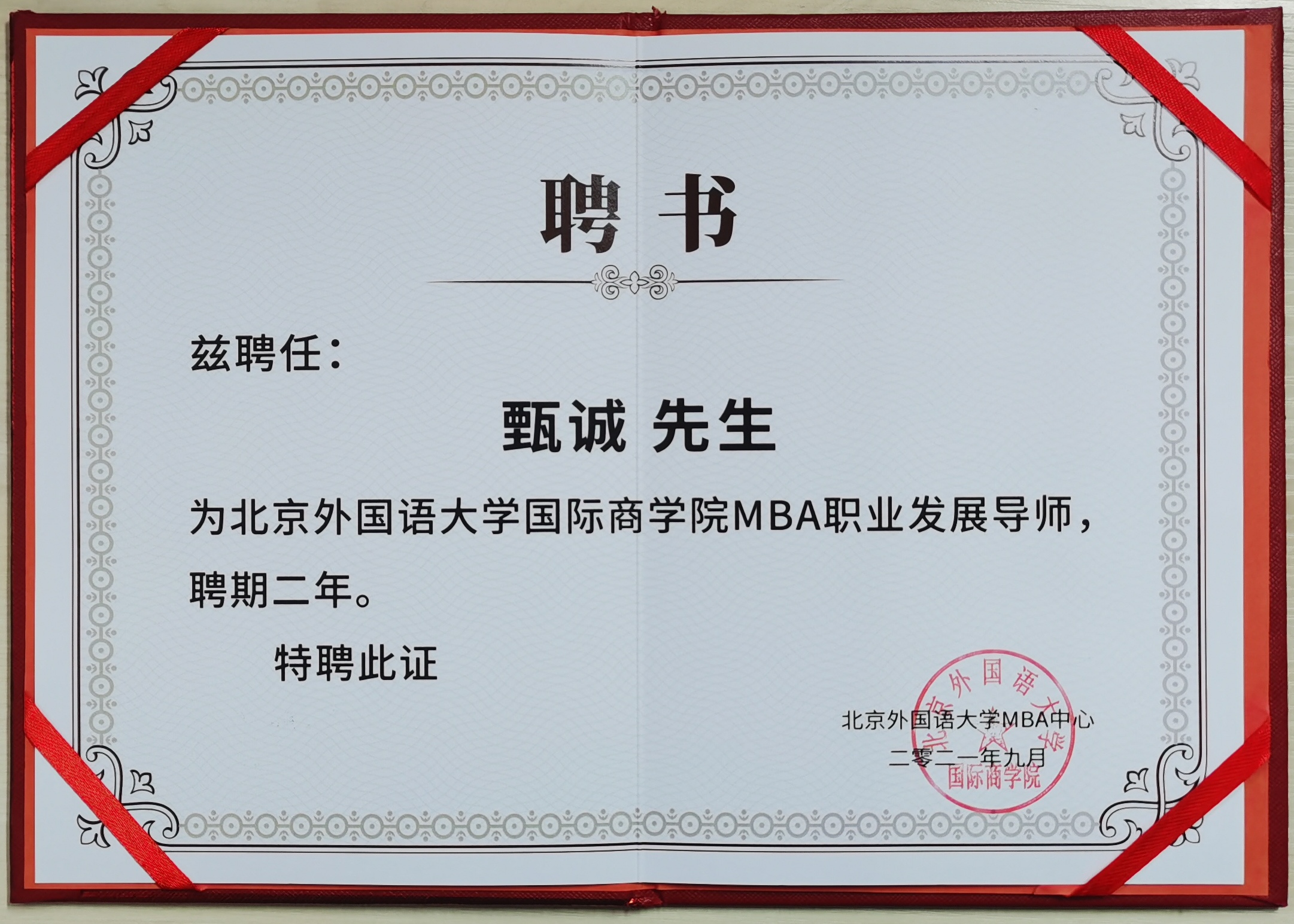 董事長(zhǎng)甄誠(chéng)-聘任為北京外國(guó)語(yǔ)大學(xué)國(guó)際商學(xué)院MBA職業(yè)發(fā)展導(dǎo)師