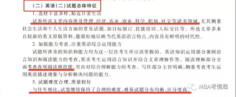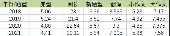 2021年數(shù)據(jù)樣本英語(yǔ)一和英語(yǔ)二分別抽選了130多萬(wàn)考生,2021考研英語(yǔ)全國(guó)平均分如下: 2021考研英語(yǔ)二抽取了1350118名考生的試卷做了統(tǒng)計(jì)分析,統(tǒng)計(jì)結(jié)果如下: 上表為英語(yǔ)二真題的平均分和難度。2021年的英語(yǔ)真題平均分為50.58分,難度系數(shù)為0.506,為近三年最低。 考研英語(yǔ)二各題型平均分對(duì)比 注:英語(yǔ)二翻譯15分,小作文10分,大作文15分 上表為換算后的英語(yǔ)二歷年真題各題型的平均分。 21考研英語(yǔ)二“完形“平均分4.41分,和前兩年相比都明顯更難。 “閱讀”A節(jié)平均分20.12分,B節(jié)“新題型”平均分5.34分,比前兩年都略難。C節(jié)“翻譯”平均分7.905分,難度與19年持平,比20考研明顯更難。 寫(xiě)作部分整體穩(wěn)定。A節(jié)”小作文“平均分5.26分,比前兩年都要更容易。B節(jié)“大作文”平均分7.56分,比19年和18年更簡(jiǎn)單,但比20年更難。 總體特征 1.選材覆蓋面廣,時(shí)代性鮮明 試卷所選文章內(nèi)容涉及健康﹑商業(yè)、環(huán)保、文化、法律、科技﹑教育等諸多領(lǐng)域。在關(guān)注語(yǔ)言和篇章結(jié)構(gòu)復(fù)雜性的同時(shí),注重內(nèi)容的思想性、知識(shí)性和趣味性。文章內(nèi)容具有普遍性,沒(méi)有專業(yè)性強(qiáng)的篇章。所選文章多來(lái)自較新的英文原版資料,能很好地反映當(dāng)代英語(yǔ)語(yǔ)言特點(diǎn),內(nèi)容具有鮮明的時(shí)代性。 2.考查目標(biāo)明確,聚焦英語(yǔ)綜合運(yùn)用能力 試題考查目標(biāo)明確,以英語(yǔ)綜合運(yùn)用能力為重點(diǎn)。英語(yǔ)知識(shí)運(yùn)用部分兼顧語(yǔ)言知識(shí)和閱讀能力的考查,要求考生運(yùn)用語(yǔ)言知識(shí)并結(jié)合文章理解作答。閱讀理解部分全面考查各項(xiàng)閱讀微技能,深人考查綜合理解語(yǔ)篇的能力。寫(xiě)作部分主旨明確、立意深刻,對(duì)英語(yǔ)綜合運(yùn)用能力提出了較高的要求。 3.試題難度合理,質(zhì)量穩(wěn)定 試卷結(jié)構(gòu)及題型與往年保持一致,考點(diǎn)分布均衡。試卷總體難度基本合理,過(guò)難、過(guò)易的試題極少。閱讀材料難度適中,寫(xiě)作試題難度與往年持平。