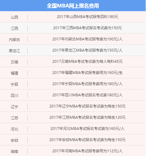 以2017年各地區(qū)MBA報名費用為例,具體如下: