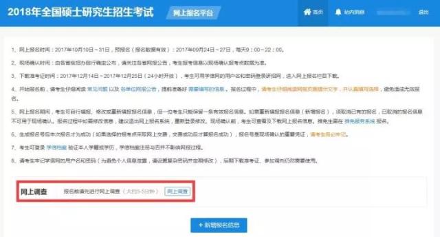完成網(wǎng)上調(diào)查后,回到步驟2.2,點(diǎn)擊“新增報名信息”進(jìn)行報名。請考生務(wù)必仔細(xì)閱讀以上頁面通知!