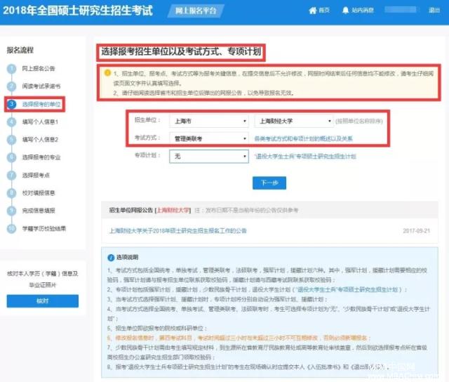 ● 報考點(diǎn)選擇:上海財經(jīng)大學(xué)在各省市的報考點(diǎn)安排可在研招網(wǎng)“網(wǎng)報公告”中查詢省市招辦和報名點(diǎn)的網(wǎng)上報名公告(http://yz.chsi.com.cn/sswbgg/)。上海市教育考試院指定上海財經(jīng)大學(xué)在上海市的報考點(diǎn)為上海財經(jīng)大學(xué)(報名點(diǎn)代碼:3109)??忌氝x擇工作或戶口所在地省級教育招生考試管理機(jī)構(gòu)指定的報考點(diǎn)考點(diǎn)辦理網(wǎng)上報名。報名與考試必須是同一地點(diǎn)。