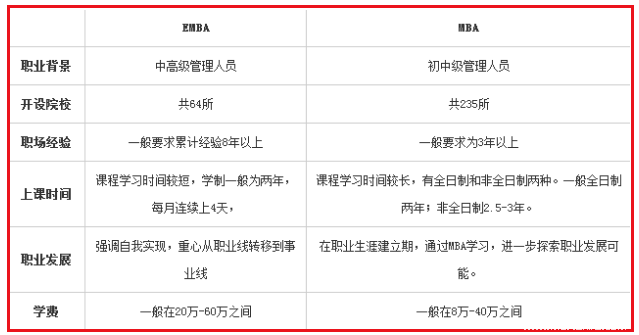 本來EMBA和MBA的交集是很少的,圈子層次不同。而且兩者在招生條件、報考流程、考試內(nèi)容等方面都有很多不一樣,很自然能區(qū)分開EMBA和MBA的學員。但是,自從EMBA改革新政策后,不管是院校還是考生,對改革后的EMBA還是比較茫然的。