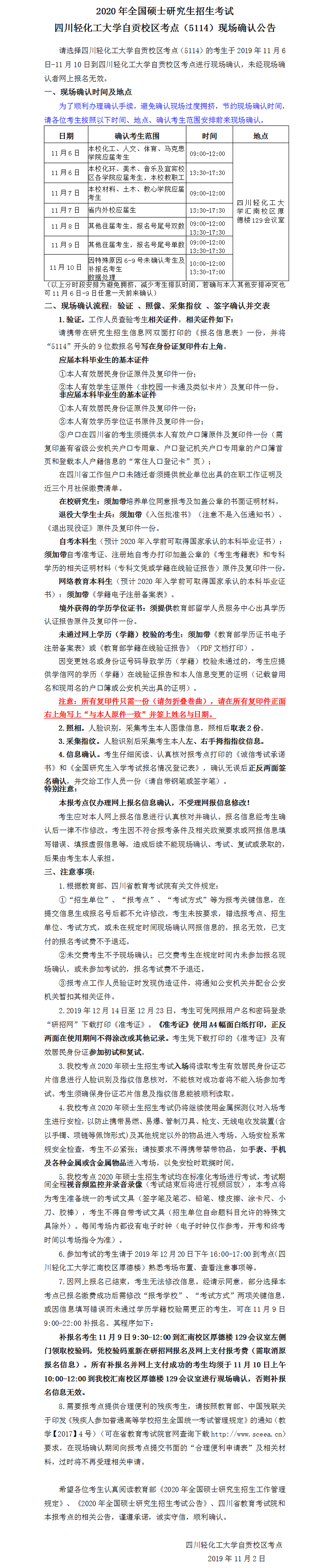 2020年全國碩士研究生入學(xué)考試宜賓學(xué)院考點(代碼為5132)現(xiàn)場確認工作有關(guān)事項說明如下,請各位考生認真閱讀和準備: