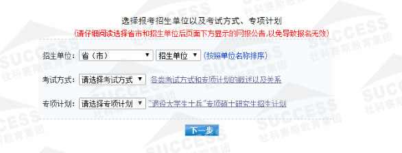 6.選擇報(bào)考單位:有三個(gè)選項(xiàng),招生單位第一欄選擇所報(bào)院校所在地,第二欄選擇自己所報(bào)院校;考試方式務(wù)必選擇管理類(lèi)聯(lián)考,專(zhuān)項(xiàng)計(jì)劃選擇無(wú),填寫(xiě)完畢以后選擇下一步。