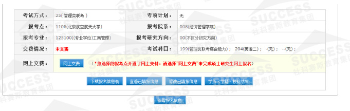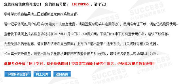 11.生成報(bào)名號(hào),下載報(bào)名信息表,確認(rèn)信息無(wú)誤且確定報(bào)考報(bào)名院校,請(qǐng)進(jìn)行網(wǎng)上繳費(fèi):