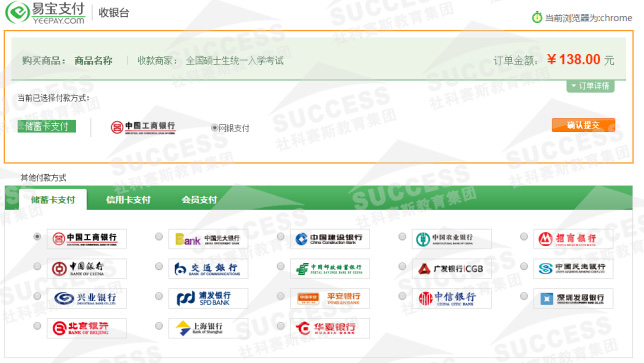 若此報(bào)考點(diǎn)開(kāi)通了網(wǎng)上支付,您必須選擇網(wǎng)上交費(fèi)來(lái)完成碩士研究生報(bào)名,否則此次報(bào)名數(shù)據(jù)無(wú)效!(如果您在本次交費(fèi)過(guò)程中交易處理失敗,您可以在網(wǎng)上報(bào)名期間隨時(shí)登錄網(wǎng)上報(bào)名系統(tǒng)進(jìn)行網(wǎng)上支付)