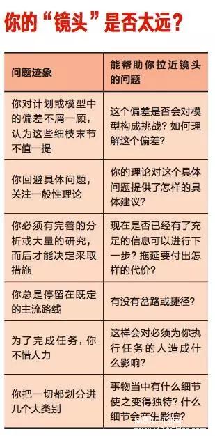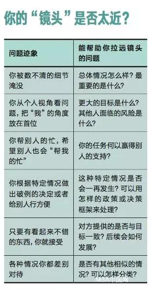“縮放”的比喻,讓我們可以客觀地討論視角差異,并鼓勵人們轉(zhuǎn)換視角:“讓我們拉近距離看看這個問題”“讓我們拉遠距離,全面考慮一下”。以縮放為基礎(chǔ)的檢查清單,可以幫助人們停止過度的個人化,提醒他們從相關(guān)原則的層面看問題,也避免過度泛化,鼓勵他們看具體情況。每個人都可以在工作中運用縮放原則,只要提出合適的問題,如某個行動是否符合總體目標,繼續(xù)推進某個構(gòu)想是否有充足的信息等。