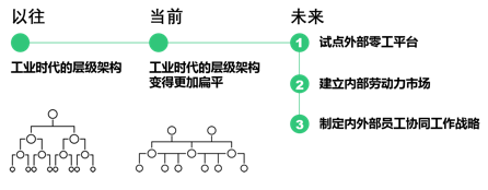 與傳統(tǒng)企業(yè)自工業(yè)時(shí)代以來一直依賴的陳舊等級(jí)管理模式相比,數(shù)字領(lǐng)軍企業(yè)能夠輕松利用技術(shù)更迅速地彌合人才缺口、啟動(dòng)新項(xiàng)目,并能更加及時(shí)地應(yīng)對市場變化。對于大型傳統(tǒng)企業(yè)來說,嘗試使用新興柔性勞動(dòng)力派遣平臺(tái),無需即刻就對現(xiàn)有管理模式作出重大調(diào)整,卻可以隨著時(shí)間的推移逐步發(fā)揮“鲇魚效應(yīng)”,通過柔性團(tuán)隊(duì)的使用來推動(dòng)革新、積累技能、建立人才檔案。自然而然地,借助外部力量,企業(yè)內(nèi)部員工團(tuán)隊(duì)也將從按崗招聘、業(yè)務(wù)職能固化的傳統(tǒng)用工方式中脫離出來,實(shí)現(xiàn)更多自我價(jià)值,也為企業(yè)創(chuàng)造更多價(jià)值。