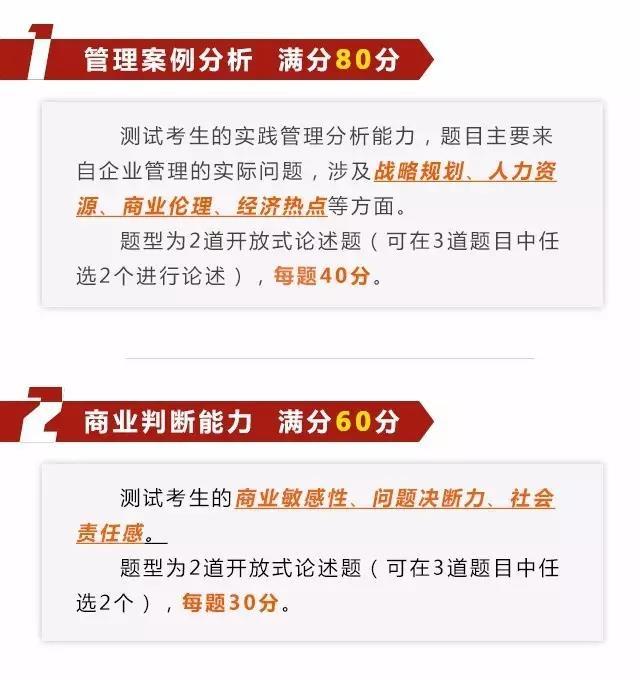 1、考生的管理實(shí)踐經(jīng)驗(yàn),涉及戰(zhàn)略規(guī)劃、人力資源、商業(yè)倫理、經(jīng)濟(jì)熱點(diǎn)等;