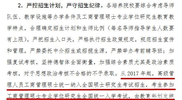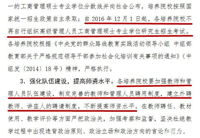 近日,教育部發(fā)布文件《教育部關于進一步規(guī)范工商管理碩士專業(yè)學位研究生教育的意見》,文件稱2017年起,高級管理人員工商管理碩士(EMBA)將納入全國統(tǒng)一的碩士研究生入學,由教育部統(tǒng)一劃線、各學校按需調整錄取。且從2016年12月1日開始,各院校不得再自行組織EMBA招生考試。