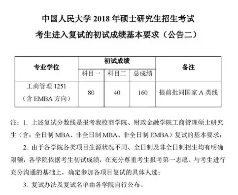 中國人民大學(xué)MBA復(fù)試線:英語二40分,綜合80分,總分160分,MPAcc復(fù)試分數(shù)線:英語二60分,綜合120分,總分235分。
