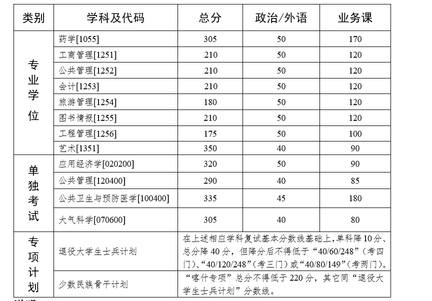 3. 工商管理[1251]、公共管理[1252]、會計(jì)[1253]、旅游管理[1254]、 圖書情報(bào)[1255]等五個專業(yè)通過提前面試的考生,適用國家 A 類線 (175/44/88)。復(fù)試及錄取要求參見相關(guān)招生單位規(guī)定。