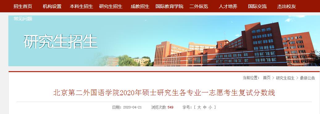 導(dǎo)讀:繼2020考研國家線公布后,34所自主劃線院校和各大院校也陸續(xù)公布2020年復(fù)試分?jǐn)?shù)線。北京第二外國語學(xué)院已經(jīng)公布2020年碩士研究生入學(xué)考試復(fù)試基本分?jǐn)?shù)線,如下所示: