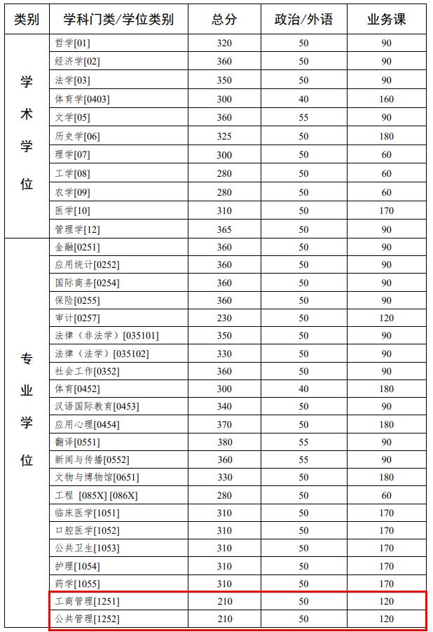 根據(jù)中山大學(xué)2021年碩士研究生招生考試復(fù)試分?jǐn)?shù)線(xiàn)的基本要求,管理類(lèi)聯(lián)考各專(zhuān)業(yè)分?jǐn)?shù)線(xiàn)如下:工商管理[1251]210/50/120、公共管理[1252]210/50/120、會(huì)計(jì)[1253]250/50/120、旅游管理[1254]180/50/120、圖書(shū)情報(bào)[1255]210/50/120、工程管理[1256]180/50/120
