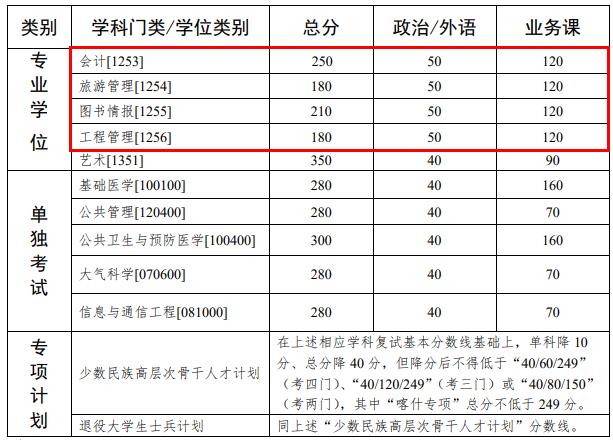 3. 工商管理[1251]、公共管理[1252]、會(huì)計(jì)[1253]、旅游管理[1254]、圖書(shū)情報(bào)[1255]等五個(gè)專(zhuān)業(yè)通過(guò)提前面試的考生,適用國(guó)家 A 類(lèi)線(xiàn)。復(fù)試及錄取要求參見(jiàn)相關(guān)招生單位規(guī)定。
