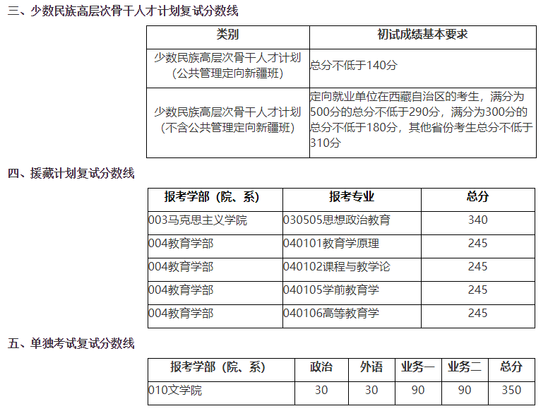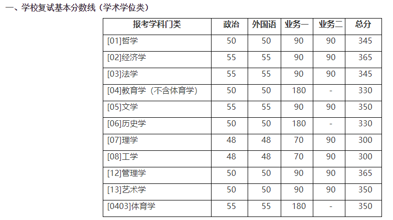 說明:此復(fù)試基本分?jǐn)?shù)線只是我校復(fù)試的最低分?jǐn)?shù)要求,接受報(bào)考的學(xué)部院系可根據(jù)整體考試情況、招生計(jì)劃、學(xué)科專業(yè)特點(diǎn)等,上調(diào)分?jǐn)?shù)要求??忌毻瑫r(shí)達(dá)到學(xué)校復(fù)試基本分?jǐn)?shù)線和報(bào)考學(xué)部院系調(diào)整設(shè)定的復(fù)試分?jǐn)?shù)線,才有資格參加復(fù)試。學(xué)部院系調(diào)整設(shè)定的復(fù)試分?jǐn)?shù)線和復(fù)試辦法,另行通知。