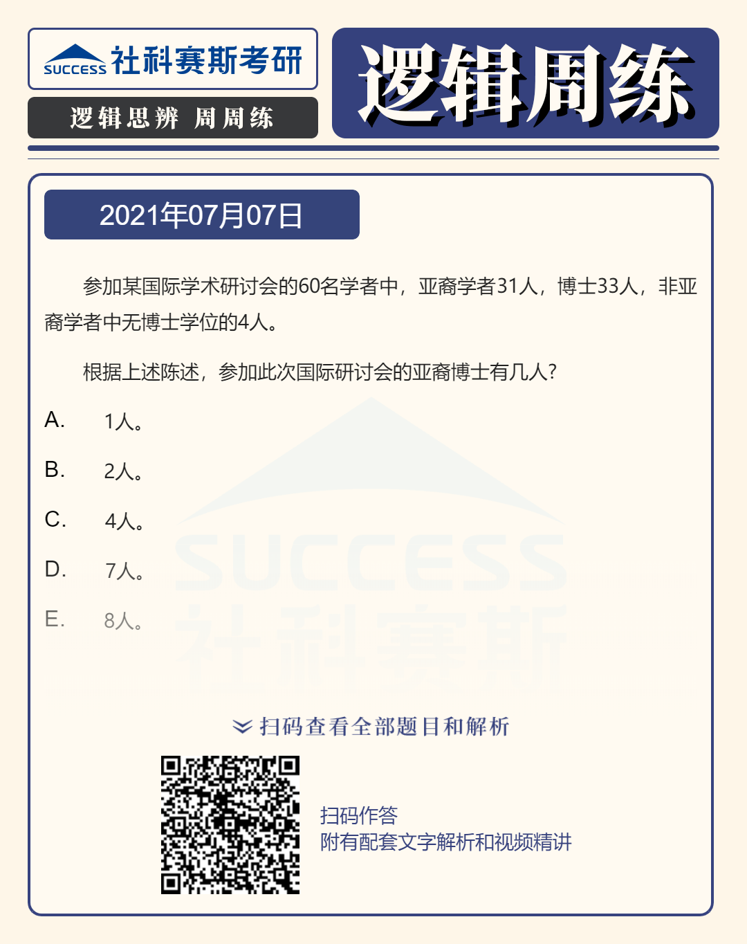 以上就是“2022MBA邏輯:2022MBA聯(lián)考邏輯習(xí)題及答案解析(7月7日)”的全部內(nèi)容,更多邏輯精選習(xí)題,請持續(xù)關(guān)注社科賽斯MBA備考網(wǎng)!