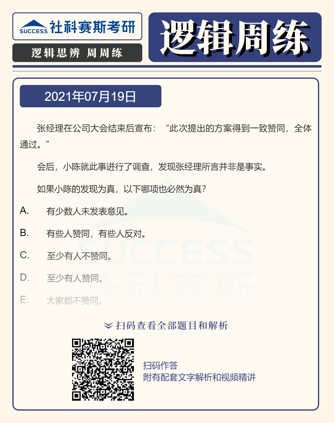 以上就是“2022MBA邏輯:2022MBA聯(lián)考邏輯習(xí)題及答案解析(7月19日)”的全部內(nèi)容,更多邏輯精選習(xí)題,請持續(xù)關(guān)注社科賽斯MBA備考網(wǎng)!