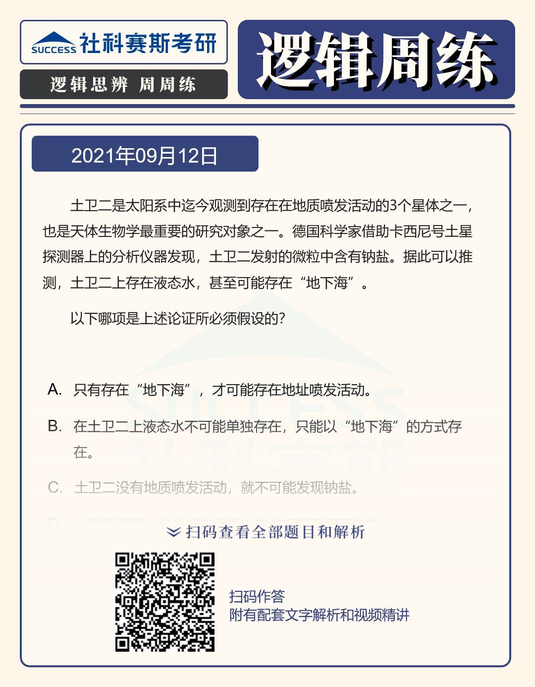 導(dǎo)讀:邏輯題型是管理類聯(lián)考考試中的必考題型,也是MBA聯(lián)考復(fù)習(xí)中的重要部分,社科賽斯MBA備考網(wǎng)小編整理了“2022MBA邏輯:2022MBA聯(lián)考邏輯習(xí)題及答案解析(9月12日)”的內(nèi)容,希望能對廣大考生有所幫助。