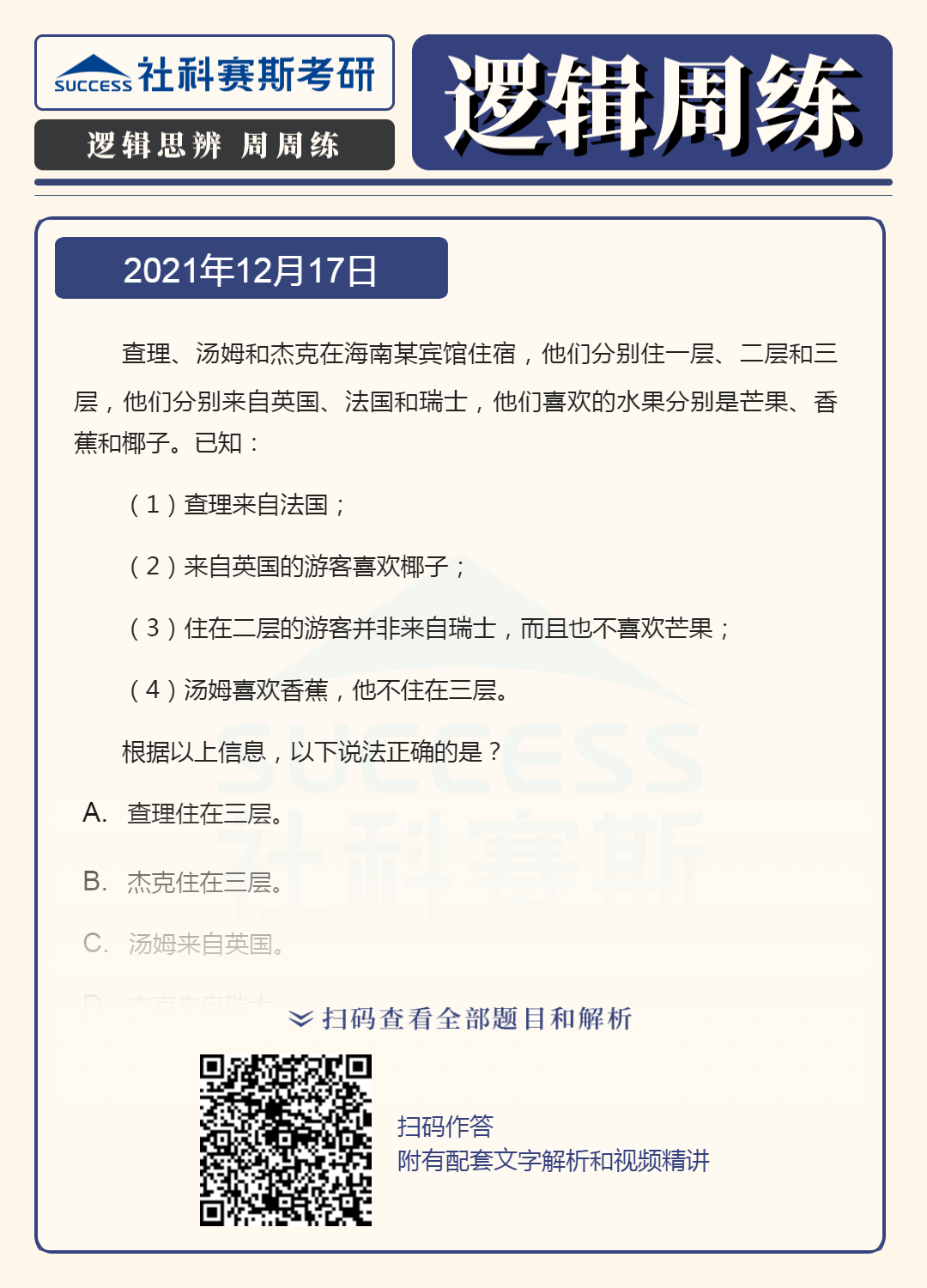 以上就是“2022MBA邏輯:2022MBA聯(lián)考邏輯習(xí)題及答案解析(12月17日)”的全部內(nèi)容,更多邏輯精選習(xí)題,請持續(xù)關(guān)注社科賽斯MBA備考網(wǎng)!