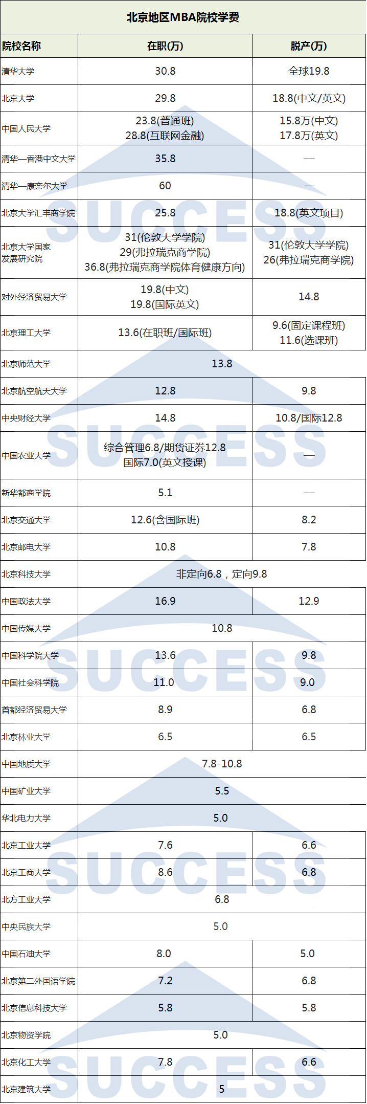 車型好、性價比高,你還有什么可考慮的? ... ... 各種都好,別再考慮了,趕緊拿下吧! 這些話我們都不陌生,買房買車買東西時都會聽到...我知道這房子好,升值快,但我買不起;奔馳寶馬是好,但我買不起。很簡單的問題,各種都好,你在考慮什么,考慮錢... 報考MBA的同學(xué)同樣有這樣的困擾,清華、北大是好,但以我現(xiàn)在的經(jīng)濟(jì)基礎(chǔ),學(xué)費太貴,我還讀不起,算啦,再過個幾年經(jīng)濟(jì)好點再考~ 海淀房子買不起,你肯定會想到通州或燕郊,無論買哪,升值是一定的。類比MBA也是一樣,學(xué)歷或職業(yè)不如意,有讀MBA的需求,目標(biāo)院校學(xué)費高,自己工作年限短,經(jīng)濟(jì)條件達(dá)不到,何不先嘗試其他學(xué)費稍低,適合自己的院校,最終總歸是自己得到提升~ 所以,既然有讀MBA的需要,就別因為學(xué)費而放棄,找到適合自己經(jīng)濟(jì)條件的院校先學(xué)習(xí)提升即可。之后經(jīng)濟(jì)更寬裕,還有更進(jìn)一步的需求,殺回名校讀個EMBA也是很好的選擇啊! 當(dāng)然,對大家有幫助的院校資訊還是要送上的,小編整理北京地區(qū)院校MBA學(xué)費,有需要的同學(xué)們找到適合自己的并為之努力吧~ 各院校學(xué)費有可能隨時作出調(diào)整,本版信息為截止發(fā)稿時最新信息,如有調(diào)整以院校網(wǎng)站公布的最新信息為準(zhǔn)。