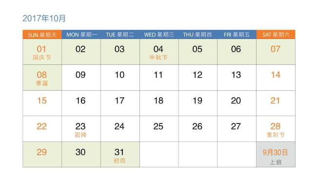 中秋+國慶節(jié):假期調(diào)整至10月8日,中秋國慶假期一起連休8天,9月30日上班。