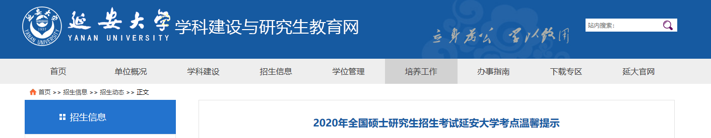2020年全國碩士研究生招生考試將于2019年12月21日—12月23日進(jìn)行,歡迎你在延安大學(xué)考點(diǎn)參加考試,延安大學(xué)碩士研究生招生考試工作領(lǐng)導(dǎo)小組溫馨提示如下: