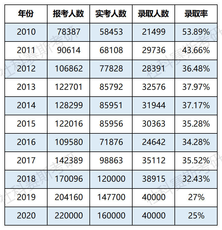 同時我們也可以明顯看出,雖然MBA報考人數(shù)逐年大幅增長,但MBA考生錄取比例整體卻呈下降趨勢,國家線也因而在近幾年有一個調(diào)高的趨勢,在2018年及2019年均維持在170分,分拆即綜合單科大致需在120分以上,英語單科需在50分以上。因此,單從報考人數(shù)來看,在2020年各商學院招生名額沒有一個明顯的增額的情況,國家線仍會設定在170分及以上。