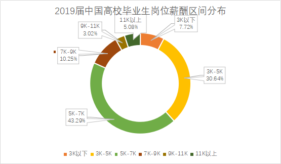 此外,根據(jù)梧桐果相關(guān)數(shù)據(jù)顯示,2019屆中國高校畢業(yè)生崗位薪酬區(qū)間的主流分布區(qū)間為5000—7000元,占比43.29%;而3000-5000元區(qū)間和3000元以下區(qū)間的占比分別為30.64%和7.72%,近四成應(yīng)屆畢業(yè)生的崗位薪酬還未達(dá)到5000元;7000元以上區(qū)間的占比為18.35%,其中11000元以上的占比僅為5.08%,高薪者極少。