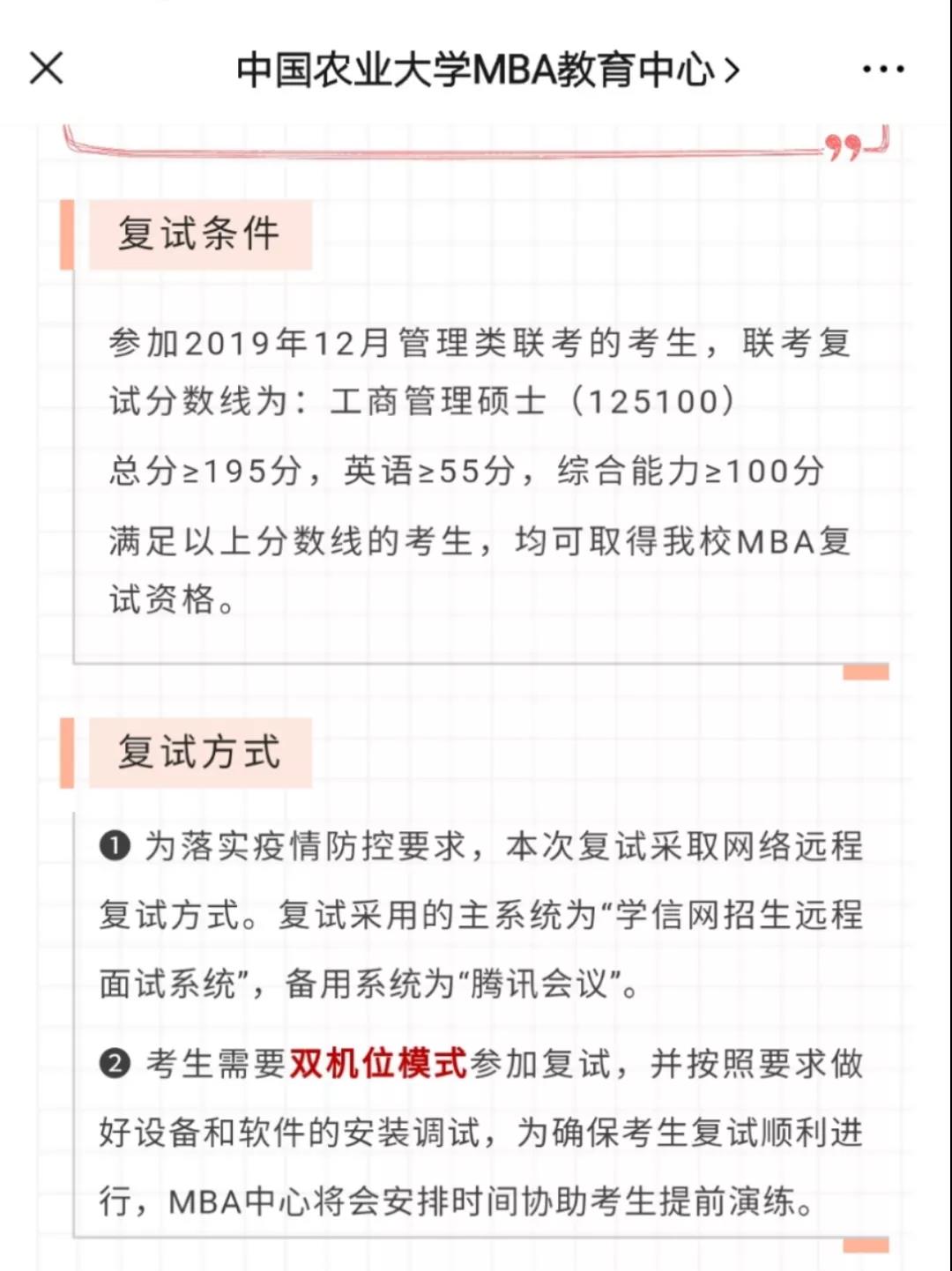 導(dǎo)讀:復(fù)試、調(diào)劑信息接踵而至,目前北京師范大學(xué)MBA、北京交通大學(xué)MBA、中國(guó)農(nóng)業(yè)大學(xué)MBA復(fù)試通知已經(jīng)公布啦!可你會(huì)用通知中的復(fù)試平臺(tái)嘛,指南來(lái)了!