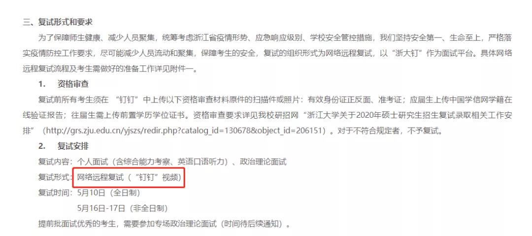 浙江大學(xué)主要使用的軟件為“釘釘”,“釘釘”經(jīng)歷了疫情期間上班族打卡、學(xué)生上網(wǎng)課的各種花式考驗(yàn),已經(jīng)相對(duì)穩(wěn)定,被很多學(xué)校納入復(fù)試平臺(tái)。