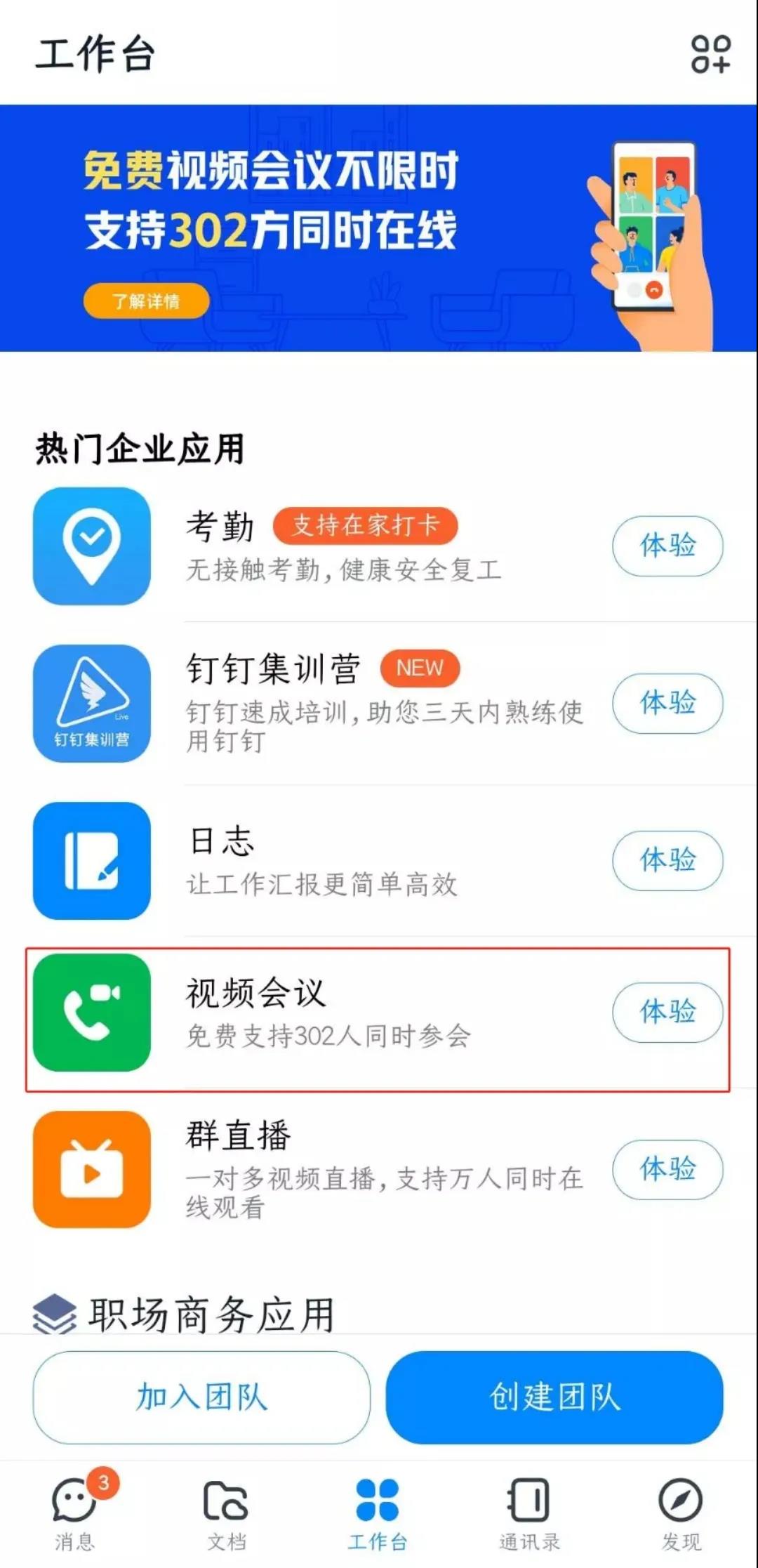 然后進(jìn)入釘釘界面,點(diǎn)擊【視頻會(huì)議】,可以選擇發(fā)起視頻會(huì)議或者加入視頻會(huì)議。