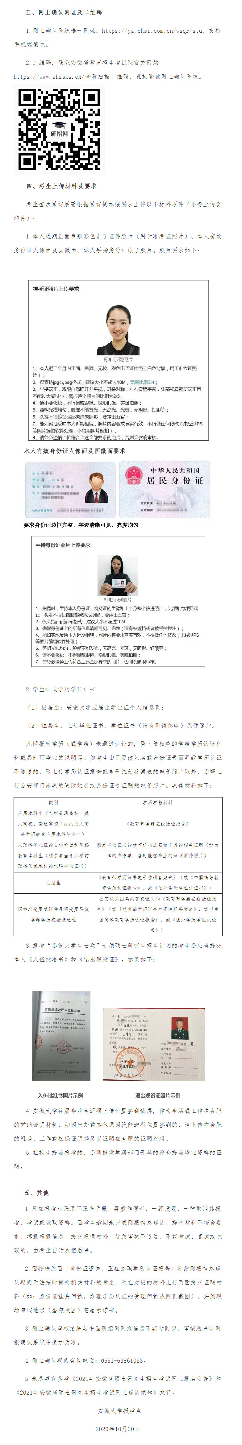 今年安徽大學報考點實行網上確認報名信息,確認期間將在網上審核考生上傳的材料并通過系統(tǒng)向考生反饋審核結果。請所有考生務必仔細閱讀此公告要求,及時查看審核結果,并按要求在規(guī)定時間內補充(修改)有關材料。未在規(guī)定時間進行網上確認以及未被審核通過的考生,報名信息無效,將不得參加考試。