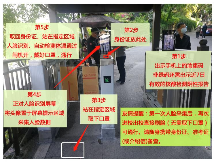 (二)校外考生于12月25日14:00—20:00抵達(dá)學(xué)校,辦理進(jìn)校手續(xù)、注冊(cè)校園門禁系統(tǒng)并熟悉考場(chǎng)??忌谥付ㄐiT(一號(hào)門、二號(hào)門、三號(hào)門、五號(hào)門、六號(hào)門均可)辦理進(jìn)校手續(xù)以及注冊(cè)校園門禁系統(tǒng)人臉識(shí)別權(quán)限,注冊(cè)成功后,考生在考試期間可在通過(guò)人臉識(shí)別和體溫檢測(cè)后,從任一校門進(jìn)出校園。已注冊(cè)校園門禁系統(tǒng)的本校應(yīng)屆考生無(wú)需辦理。