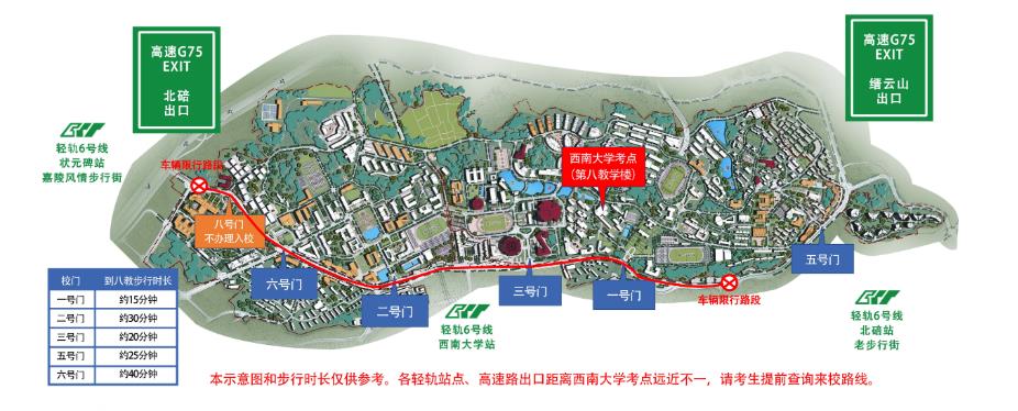 由于北碚區(qū)路網(wǎng)改造,西南大學(xué)校外主干道實(shí)行車輛限行,限行路段僅允許公共交通車輛、周邊單位(居民)車輛駛?cè)?,其余車輛駛?cè)雽⑹艿浇煌ㄟ`章處罰,且限行路段因道路變窄非常擁堵,故建議考生乘坐輕軌、公交車等公共交通工具前往考點(diǎn)。確需駕車前往考點(diǎn)的,建議走G75高速縉云山出口下道行至西南大學(xué)五號(hào)門即停即走(擁堵慎選),或走北碚出口下道行至嘉陵風(fēng)情步行街停車,換乘輕軌至西南大學(xué)站,步行前往考點(diǎn)。