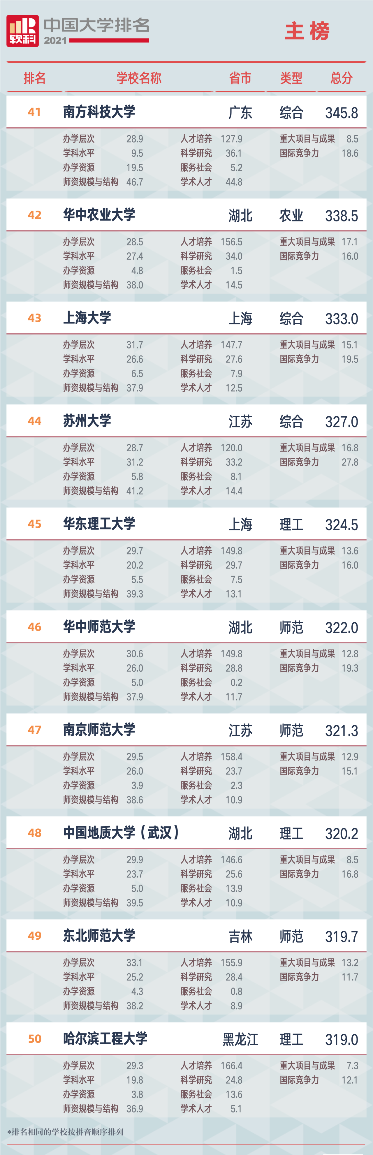 “軟科中國大學排名”,前身是“軟科中國最好大學排名”, 自2015年首次發(fā)布以來,以專業(yè)、客觀、透明的優(yōu)勢贏得了高等教育領域內外的廣泛關注和高度認可,已經成為具有重要社會影響力和權威參考價值的中國大學排名領先品牌。軟科中國大學排名以服務中國高等教育發(fā)展和進步為導向,緊跟國家高等教育的方針、政策,用中國標準評價中國高校。2021軟科中國大學排名(主榜)的上榜高校共有582所,清華大學、北京大學、浙江大學占據(jù)前三,上海交通大學、南京大學位列全國前五。