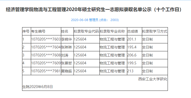 近日,全國各大研究生院校已公布2020研究生擬錄取名單。2020年研究生擬錄取名單不僅對于2020考研的同學(xué)很重要,對于2021考研的同學(xué)也很重要。2021考研的小伙伴可以通過2020年擬錄取名單分析今年的考情,從而做出最適合自己的考研決策。今天小編就整理了“2020年西安工業(yè)大學(xué)經(jīng)濟(jì)管理學(xué)院物流工程與管理專業(yè)擬錄取名單公示”的相關(guān)內(nèi)容,希望能對大家有所幫助。