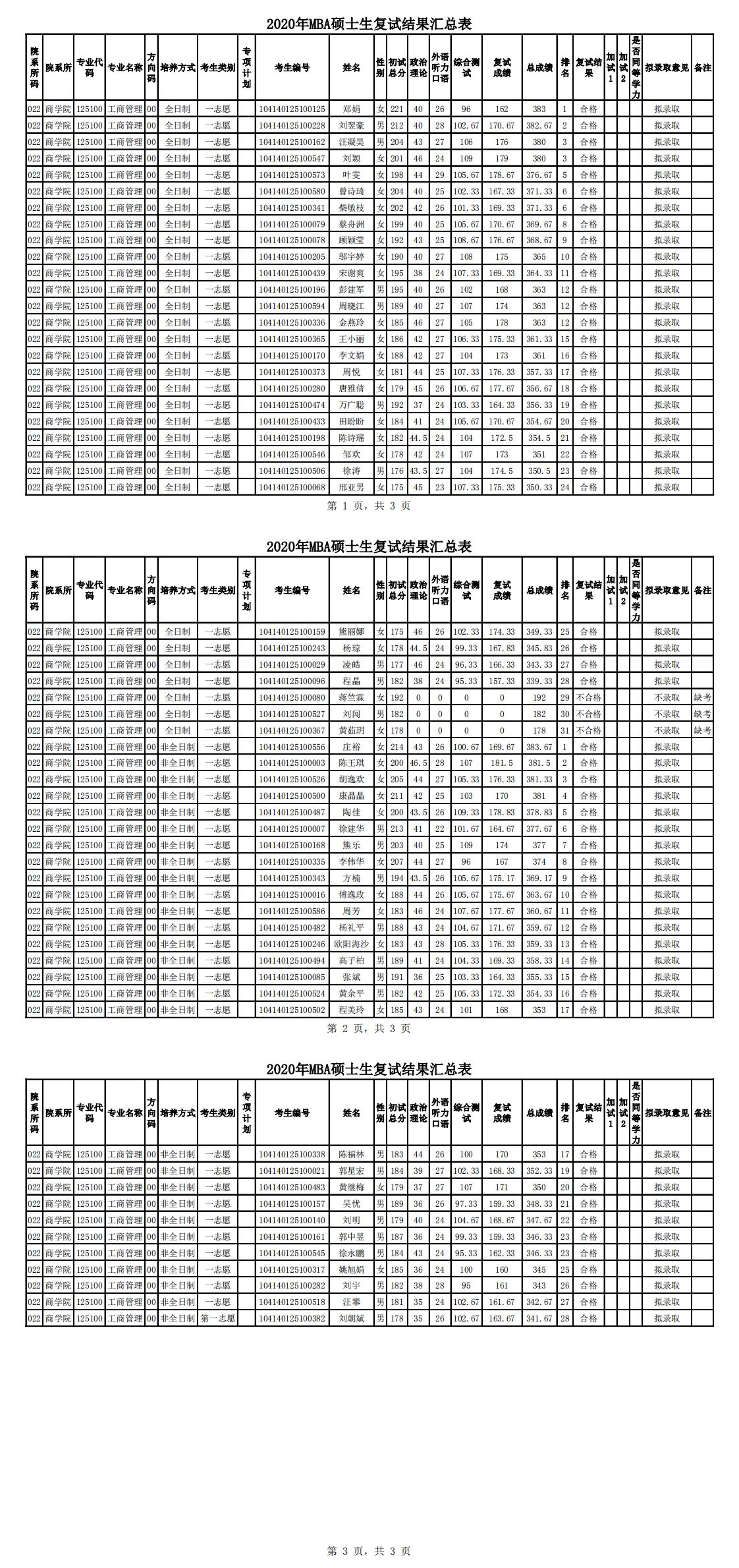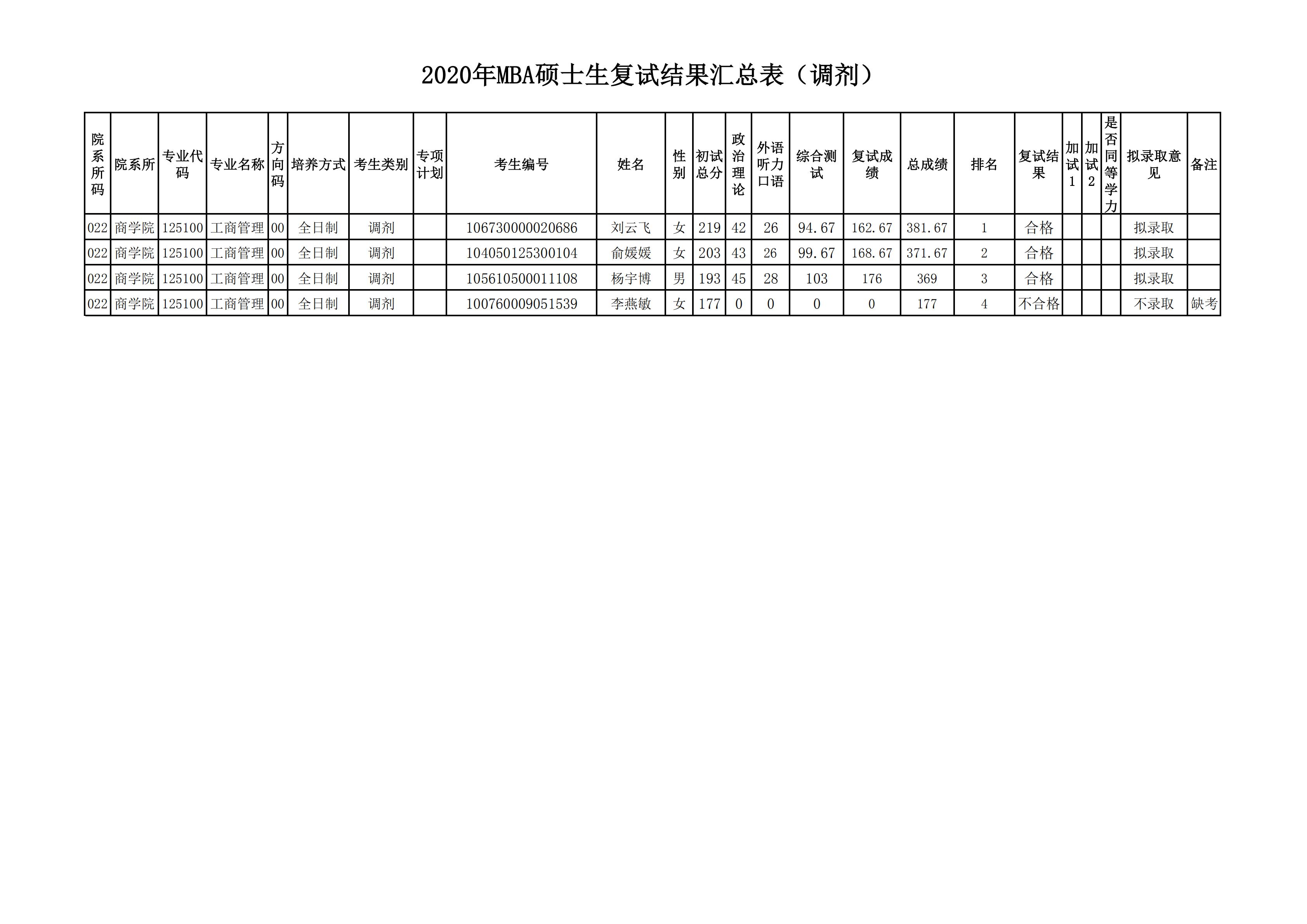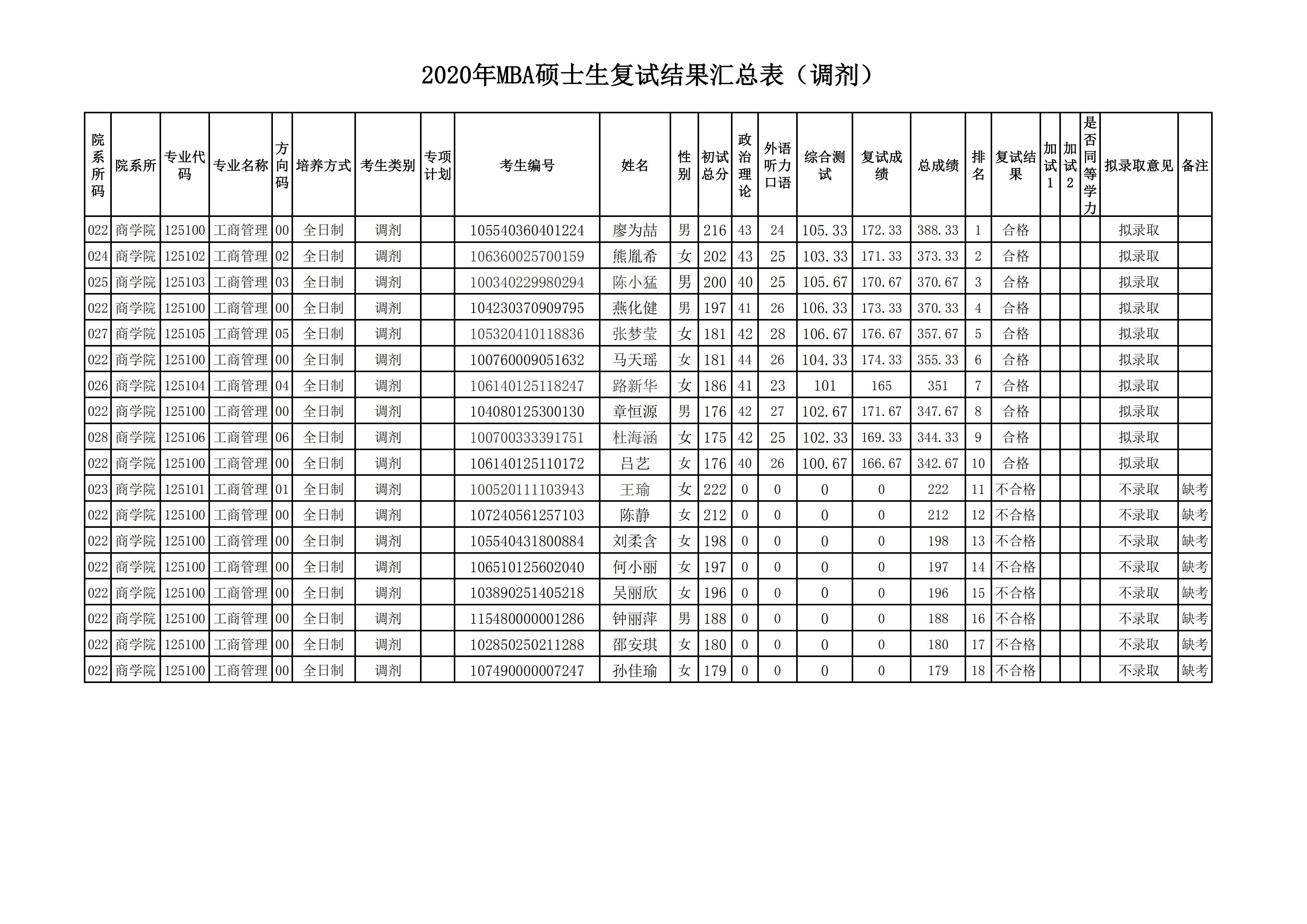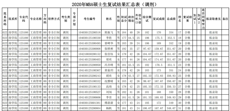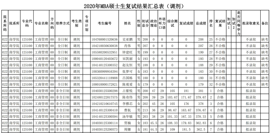2020MBA研究生復(fù)試結(jié)果匯總表