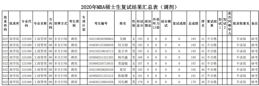 2020MBA研究生調(diào)劑復(fù)試結(jié)果匯總表