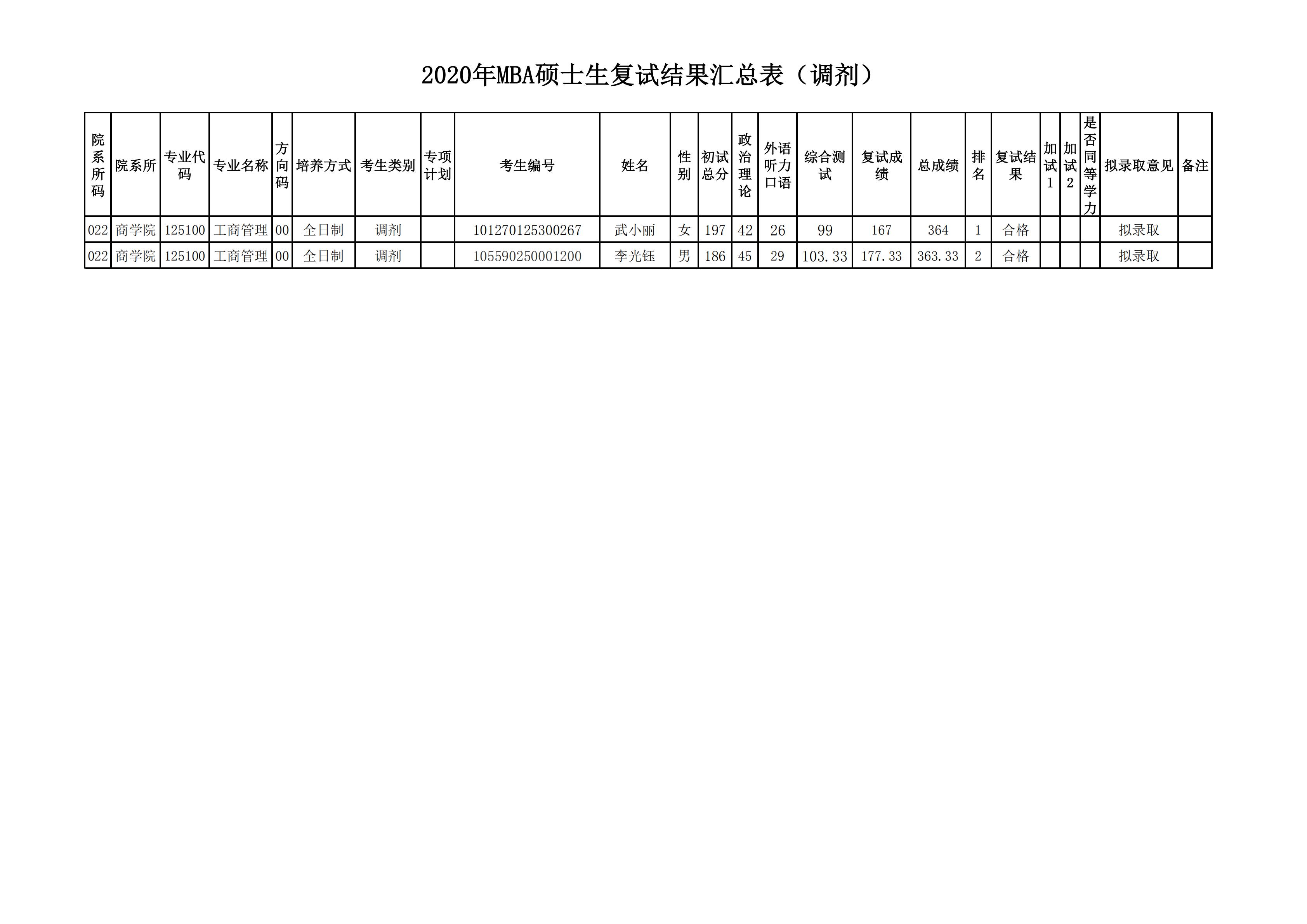 2020MBA研究生調(diào)劑二批復(fù)試結(jié)果匯總表