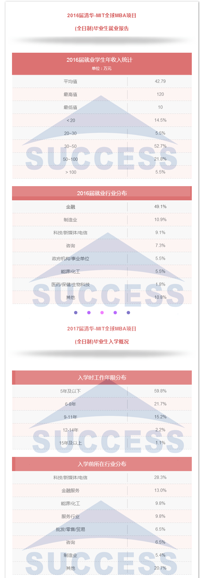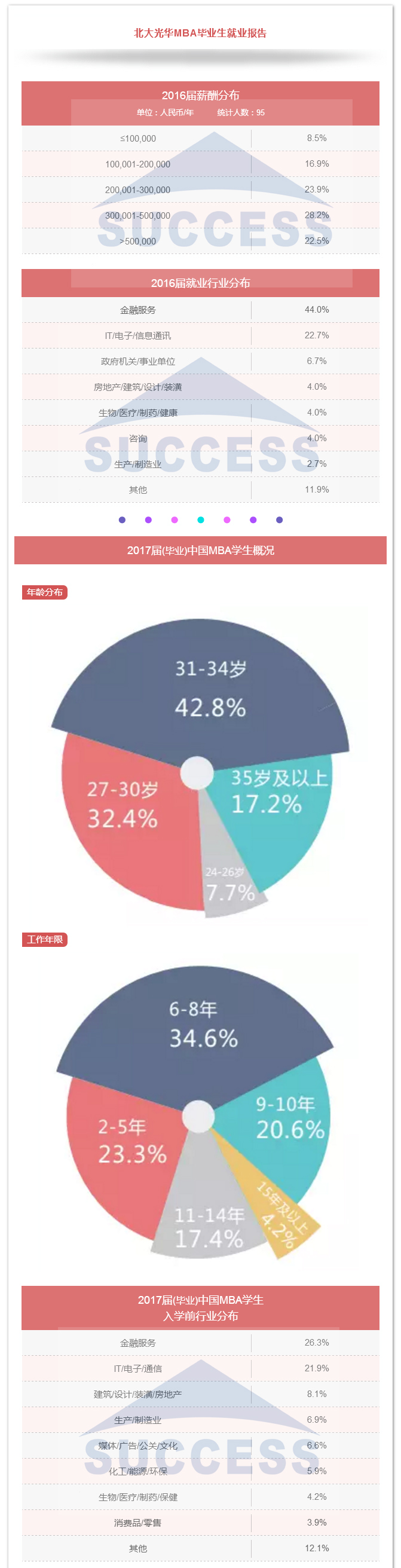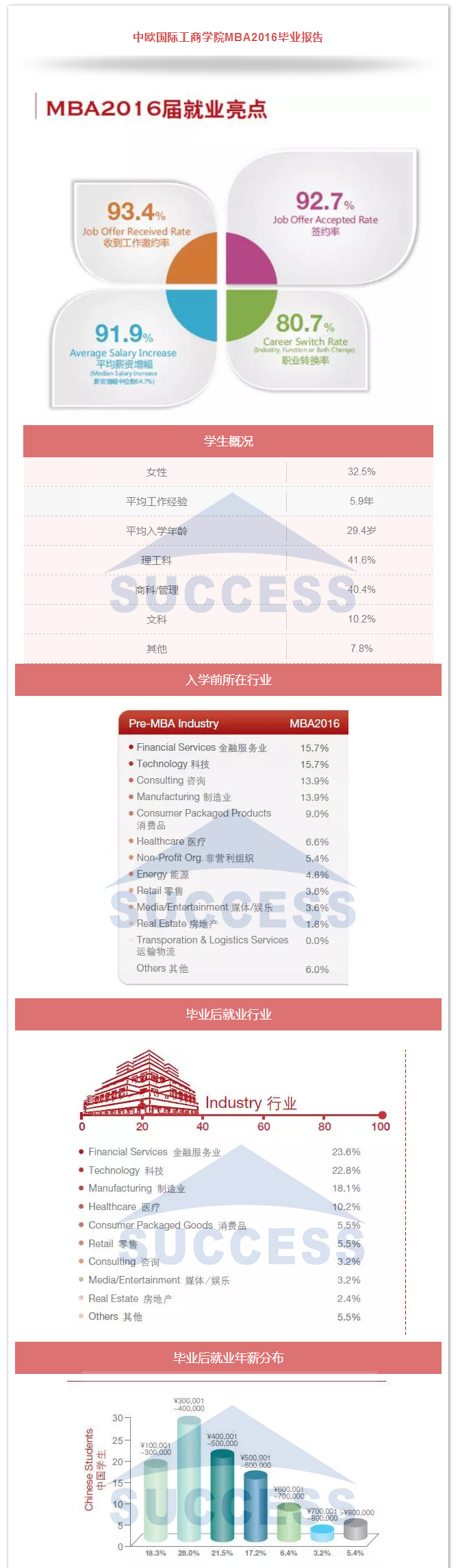 每位決定讀mba的同學(xué)或許都有這樣的疑問: ??? 商學(xué)院招收學(xué)生的平均年齡是多少? 35歲在同學(xué)中會偏大嗎? 工科男,一直在技術(shù)崗,考取希望大嗎? 工作年限短,管理經(jīng)驗薄弱,面試能過嗎? 傳統(tǒng)行業(yè)轉(zhuǎn)金融,有機(jī)會嗎? 畢業(yè)后年薪能達(dá)到多少? ... ... 這些問題大家或多或少都會存在,那商學(xué)院學(xué)生來源和畢業(yè)之后的發(fā)展到底是怎樣,小編整理了以下四所院校的就業(yè)報告,帶大家解開疑團(tuán)。 結(jié)論 名校MBA學(xué)生越來越年輕化,年齡大不會成為優(yōu)勢,反而帶來兩個后果,一個是提高了老師對你的預(yù)期,即認(rèn)為較長的工作時間應(yīng)該有較高的職位和豐富的管理經(jīng)驗,二是讀MBA后收益時間短,不容易有突破。 MBA是實現(xiàn)薪資增幅和職業(yè)轉(zhuǎn)換最便捷高效的途徑,是成為金領(lǐng)的必經(jīng)之路。 選擇SUCCESS,選擇成功!