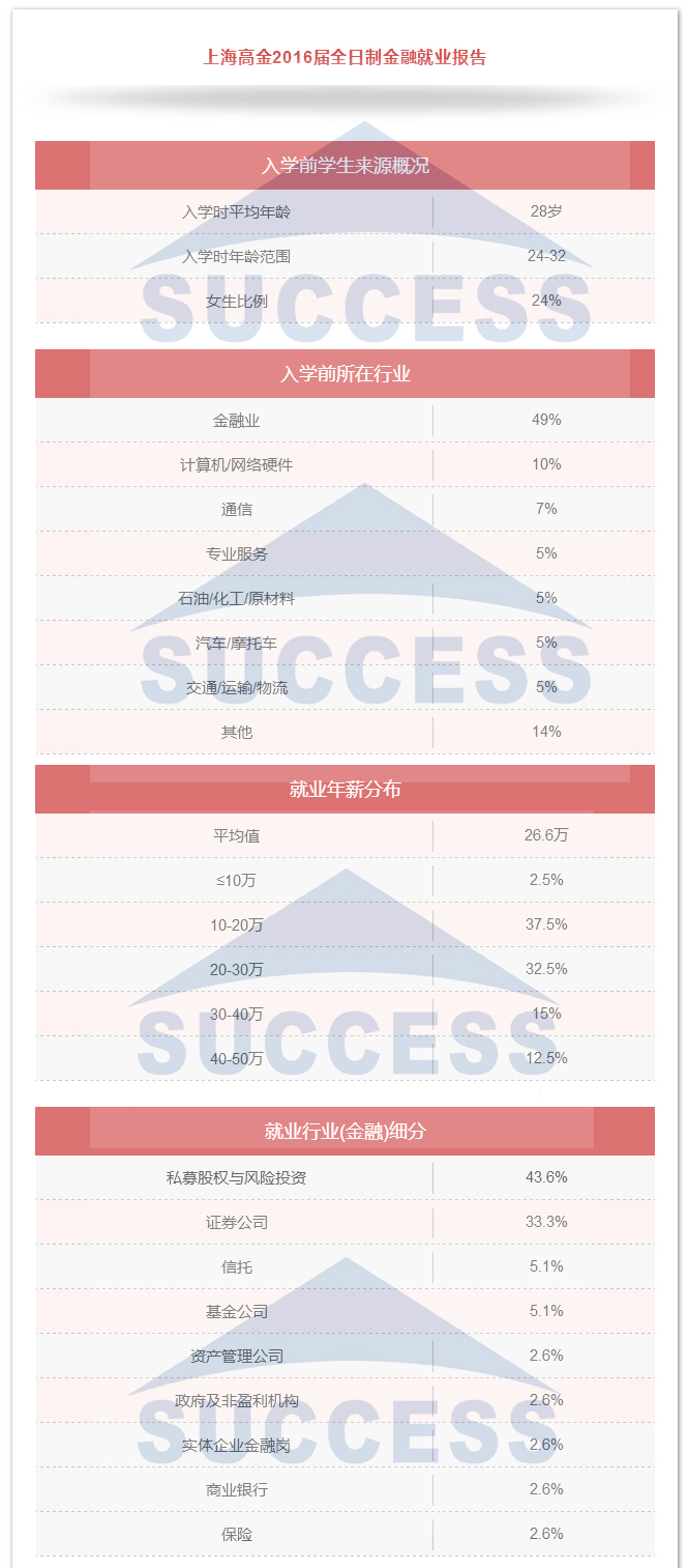 通過上海高金2016屆全日制金融就業(yè)報告,入學(xué)平均年齡28歲,畢業(yè)后進(jìn)入私募及證券公司高達(dá)77%。