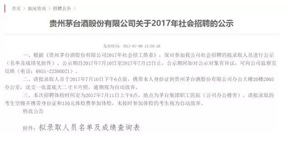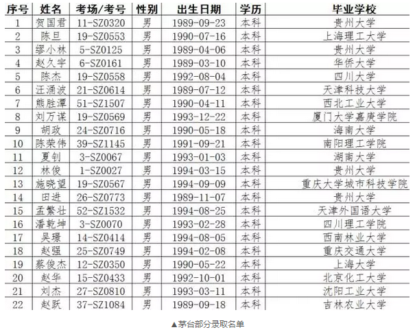 7月9日,茅臺公布了一份文化考試后,356人的擬錄取名單,雖然招聘的是制酒、制曲的合同學(xué)徒工,但在這份名單中,優(yōu)秀畢業(yè)生扎堆,甚至還有985高校的碩士。