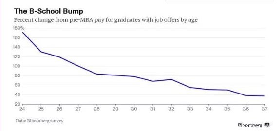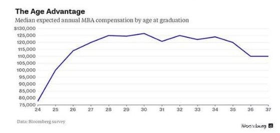 2014年調(diào)查了10000名全職MBA畢業(yè)生后發(fā)現(xiàn),在30歲之前,得到MBA學(xué)位的年紀(jì)越大,薪水也就越高。這也能夠解釋的清楚:一個28歲的MBA畢業(yè)生比一個24歲的有更多經(jīng)驗和教育。令人驚奇的是,30歲之后,經(jīng)驗和教育帶來的優(yōu)勢迅速下降。