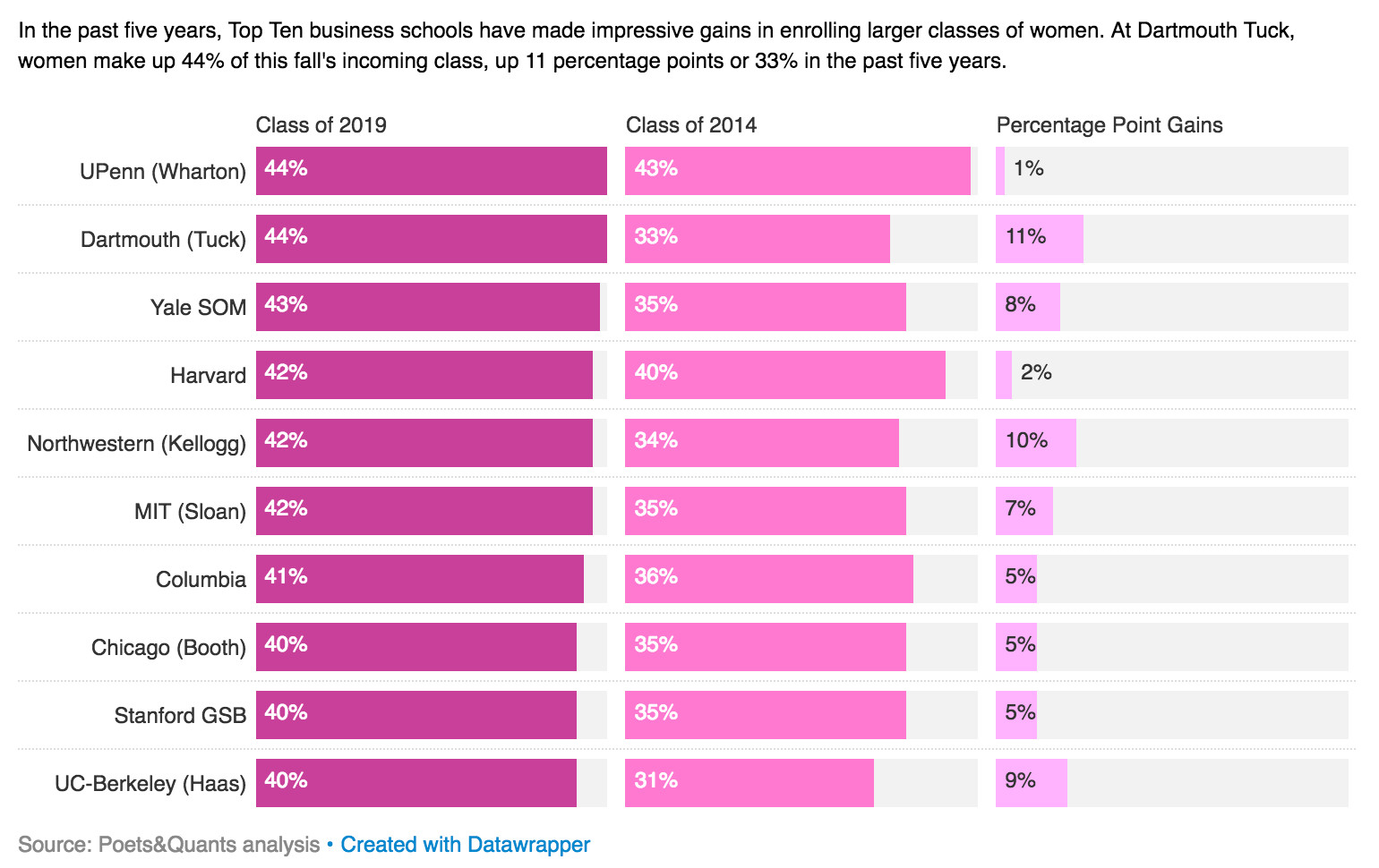 Forté基金會的數(shù)據(jù)也顯示,很多商學(xué)院在鼓勵女性參加MBA課程方面已經(jīng)取得了很大的進(jìn)展。例如,在過去的五年里,每一個排名前十的MBA專業(yè)都在夸耀他們課堂上的女性比以往任何時候都多。在達(dá)特茅斯大學(xué)塔克商學(xué)院,女性在2017年的入學(xué)學(xué)生中占44%,比2014年的33%上升了11個百分點(diǎn)。西北大學(xué)的凱洛格商學(xué)院在一位女性院長的領(lǐng)導(dǎo)下,在同一時間段內(nèi)將女性入學(xué)人數(shù)增加了10個百分點(diǎn),從34%增加到42%(見下表)。
