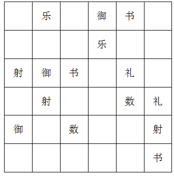 36. 有一6×6的方陣,它所含的每個(gè)小方格中可填入一個(gè)漢字,已有部分漢字填入。現(xiàn)要求該方陣中的每行每列均含有禮、樂(lè)、射、御、書(shū)、數(shù)6個(gè)漢字,不能重復(fù)也不能遺漏。
