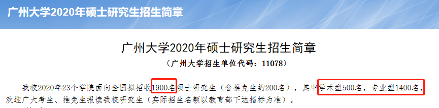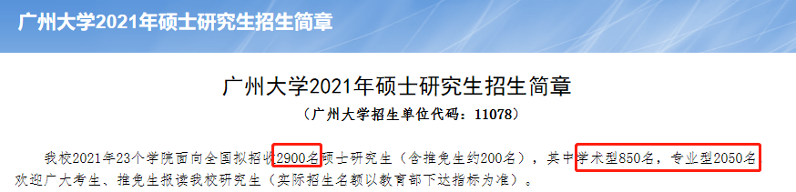 廣州大學(xué)9月14日公布2021年招生簡(jiǎn)章,擬招收2900人(含推免生約200名),其中學(xué)術(shù)型850名,專(zhuān)業(yè)型2050名。相比較2020年的1900名招生計(jì)劃相比,擴(kuò)招1000人!其中專(zhuān)碩擴(kuò)招占比較高,擴(kuò)招650名,學(xué)碩擴(kuò)招350名。