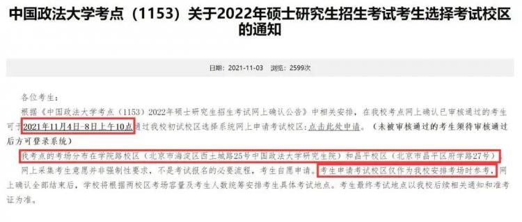 中國政法大學(xué)發(fā)布了考生選擇考試校區(qū)的通知:已經(jīng)通過了網(wǎng)上審核的考生可以本著自愿原則在11月8日上午10點之前申請考試校區(qū)。