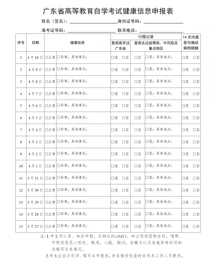 3?? 12月11日起,所有考生均須進行考前14天自我健康觀察,每天如實在廣東省教育考試院微信公眾號「辦事服務」—「健康上報」中提交本人健康狀況和行動軌跡等相關(guān)信息,如實填寫考前14天個人健康信息申報表,并在參加每場考試時提交考點工作人員。