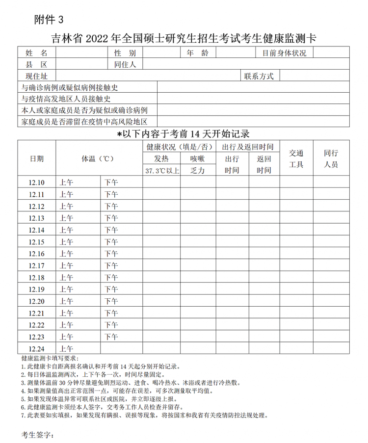 2?? 做好自我健康監(jiān)測。從考前第14天開始,所有考生需下載、填寫《吉林省2022年全國碩士研究生招生考試考生健康監(jiān)測卡》(詳見吉林省教育考試院官方網(wǎng)站,請考生自行下載打印),填報個人身體狀況。
